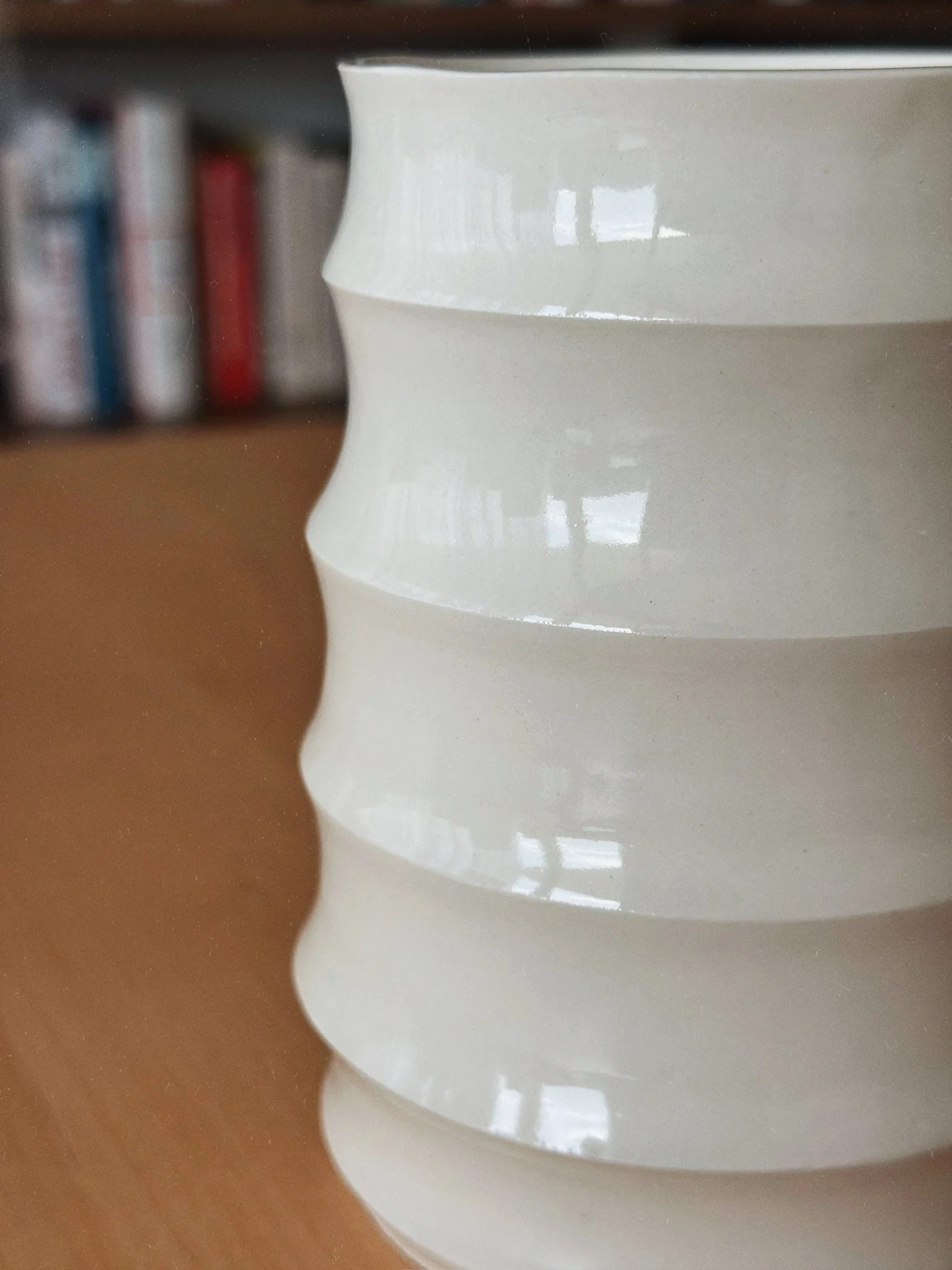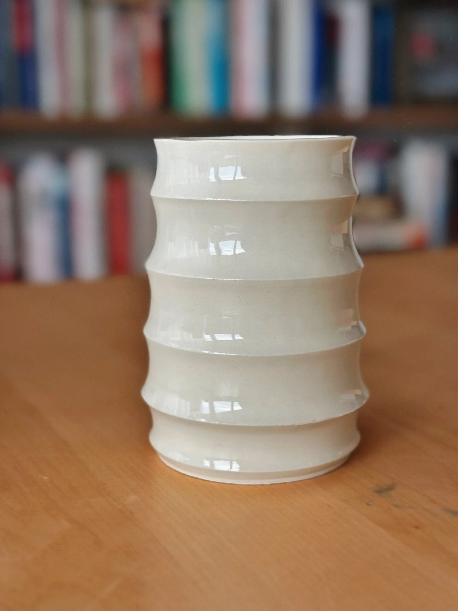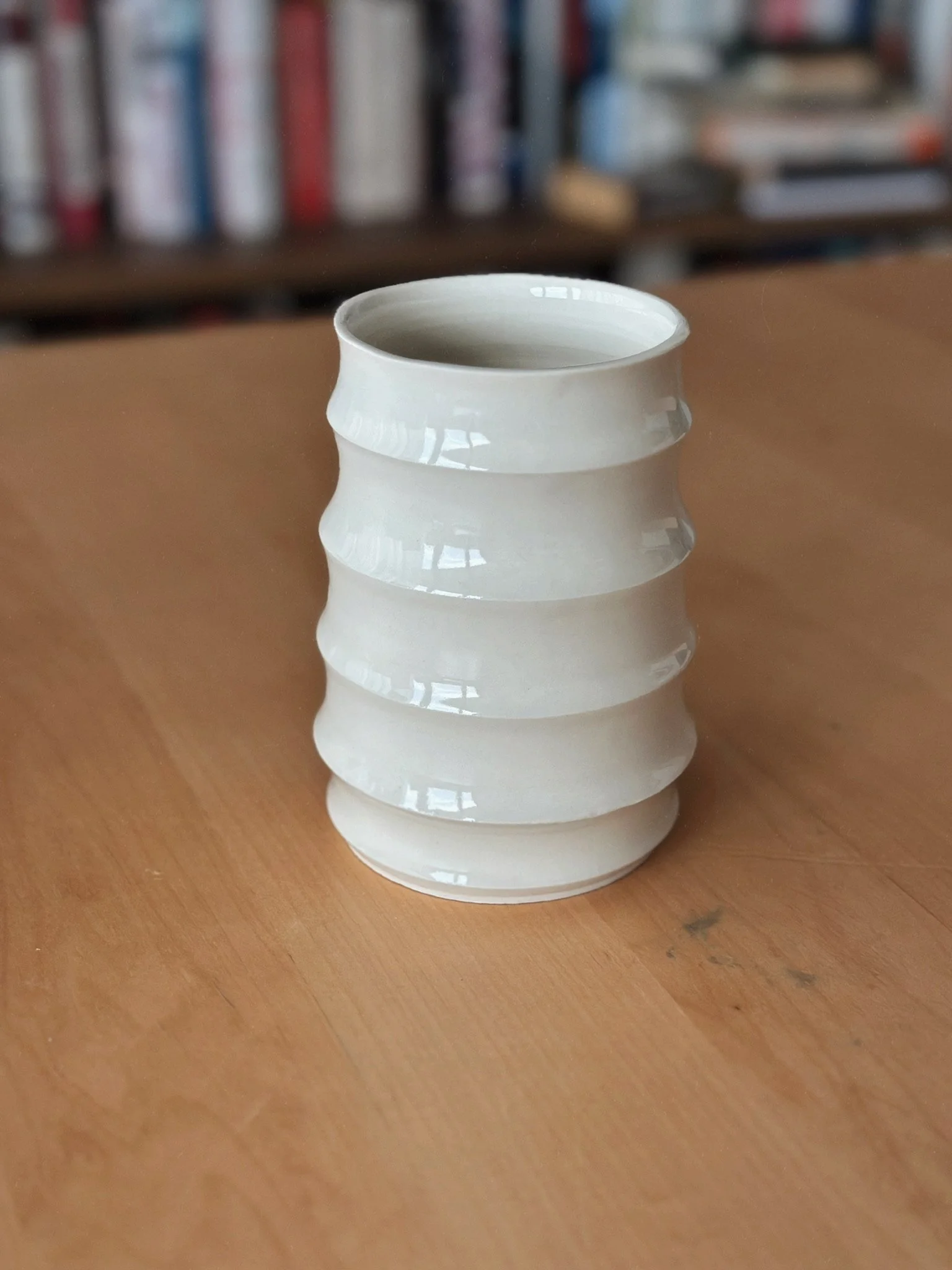 Use this cup however you want. Hot or cold liquids, absolutely! Use it to house your toothbrush, yes! This cup is made of porcelain and glazed with clear, so you get the pure, milky porcelain white colour. The divets are sharp and crisp, but also perfectly sized for fingers.